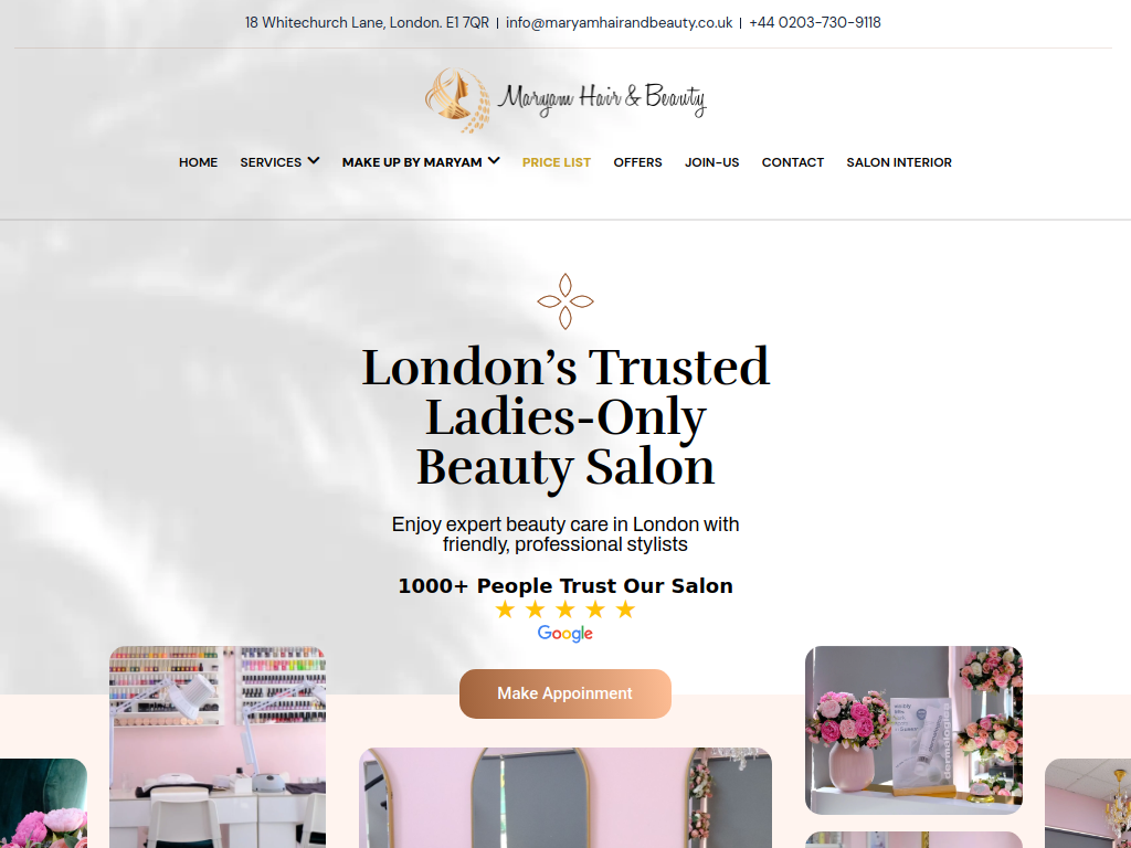 Maryam Hair & Beauty is a beauty and salon WordPress website developed by Vabinor Web IT, where the client hired our development team through the LinkedIn platform. The project focused on creating a modern, responsive, and user-friendly website that showcases salon services, highlights the ladies-only experience, and builds trust through team presentation and clear booking calls-to-action. The website strengthens the brand’s local presence and supports increased customer engagement and appointments.